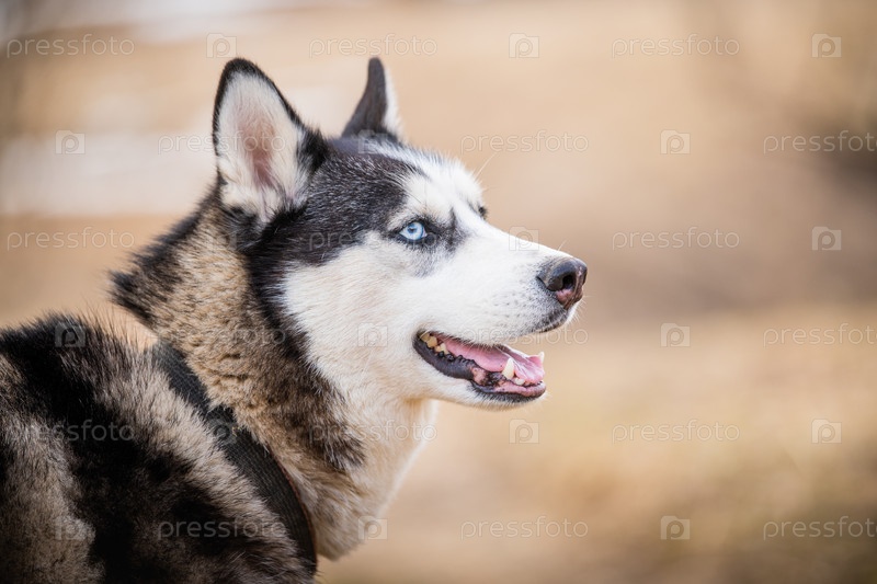 Портрет счастливой эмоциональной хаски. Сибирский хаски черно-белого окраса с голубыми глазами