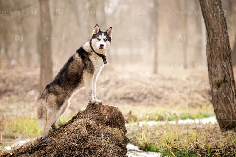 Портрет великолепного сибирского хаски, стоящего на фоне природного северного пейзажа