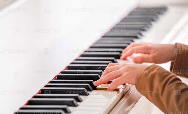 Селективный фокус на детских пальцах и клавишах пианино для игры на пианино. Есть музыкальный инструмент для концерта или обучения музыке. Закройте руку ребенка-музыканта, играющего на пианино на сцене