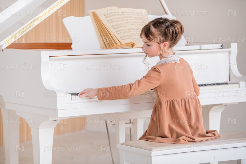 Маленькая девочка играет на большом белом пианино в яркой солнечной комнате