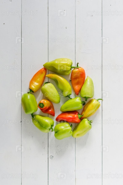 Сладкие перцы. Свежий урожай красочных перцев на белом деревянном фоне