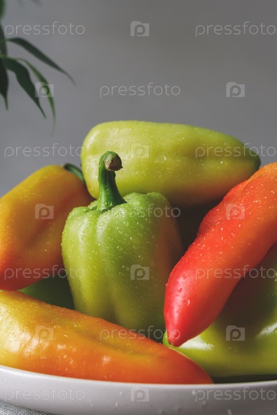 Сладкие перцы. Свежий урожай разноцветных перцев на тарелке на краю стола. В тени