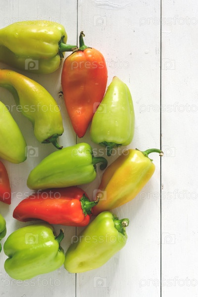Сладкие перцы. Свежий урожай красочных перцев на белом деревянном фоне