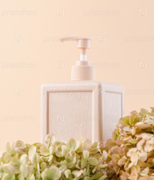Натюрморт. Бежевый косметический контейнер для мыла или крема на бежевом фоне. Среди цветущих гортензий. Концепция
