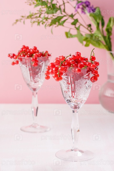 Свежая красная смородина в хрустальных бокалах на розовом фоне