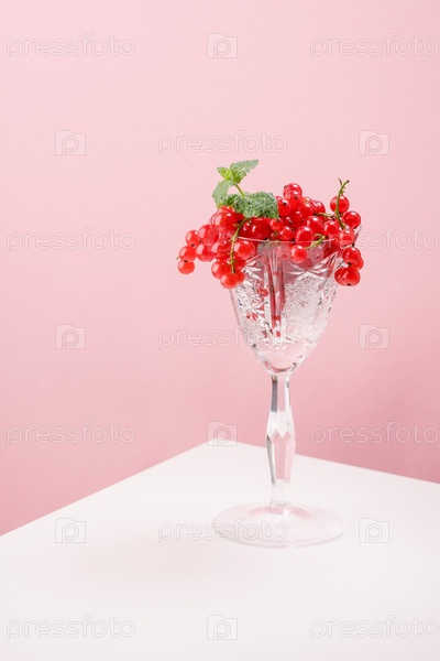 Красная смородина в хрустальном бокале на розовом фоне. Концепция
