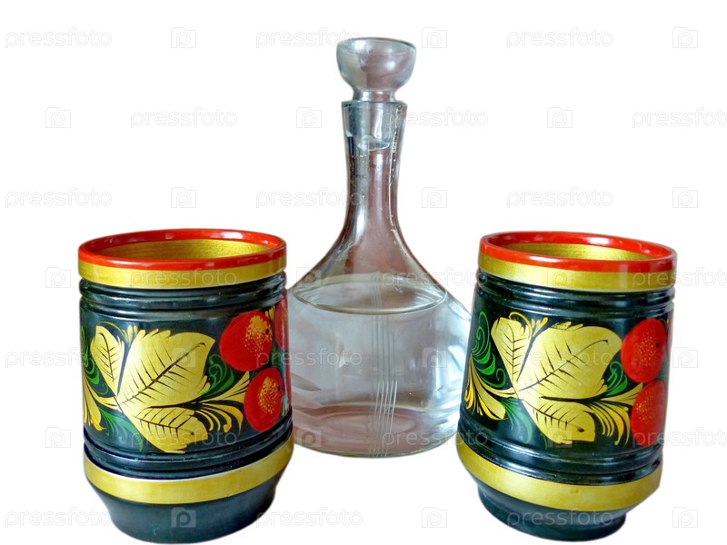Яркие хохломские стопки и графин с водкой, выделенные на белом фоне. Хохлома - старинное русское народное ремесло 17 века. Традиционными элементами хохломы являются красные сочные ягоды рябины и клубники