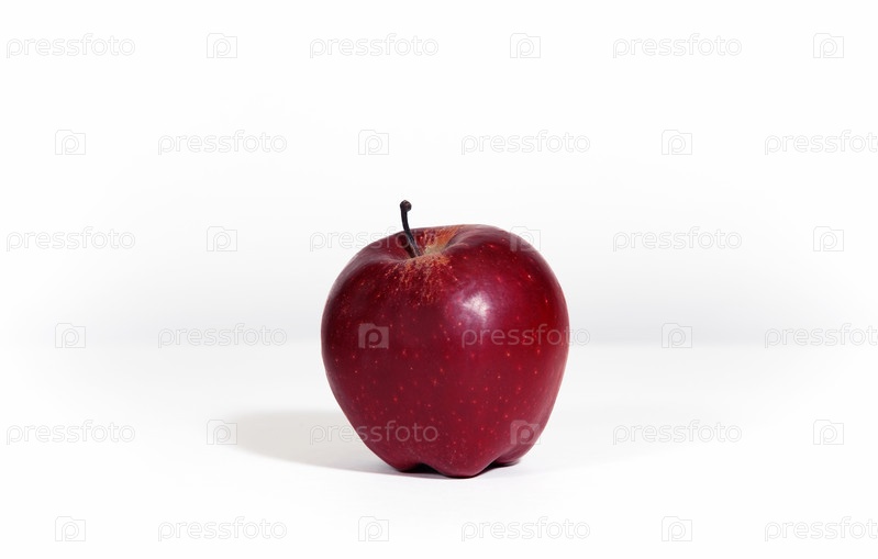 Красное спелое яблоко на белом фоне с жесткой тенью. Яблоко на столе на кухне