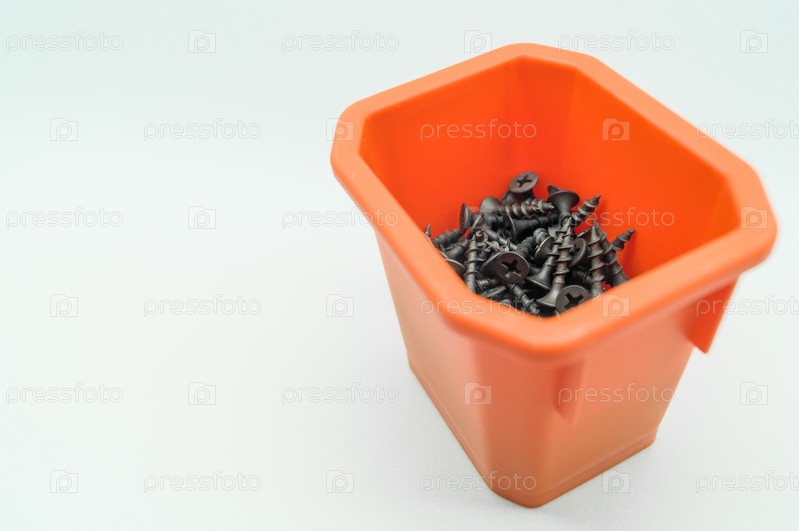 Черные винты в оранжевой коробке. Россыпь металлических креплений. Крупный план коротких винтов. Избирательный фокус, изолированный на белом