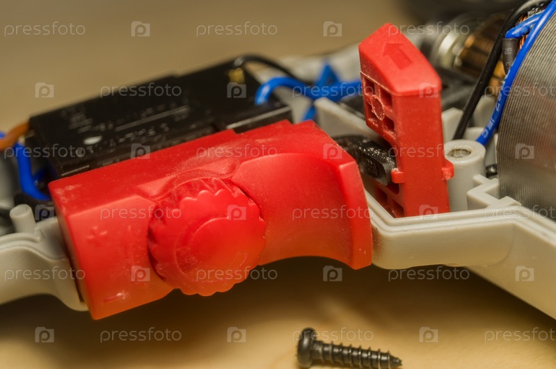 Ремонт электродрели. Разобранные рабочие электроинструменты. Сверло выходит из строя, требует ремонта и замены необслуживаемых деталей. Выборочный фокус