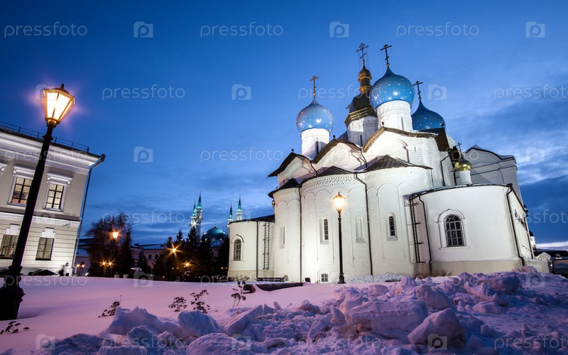 Благовещенский собор Казанского Кремля на фоне размытого неба зимой 5