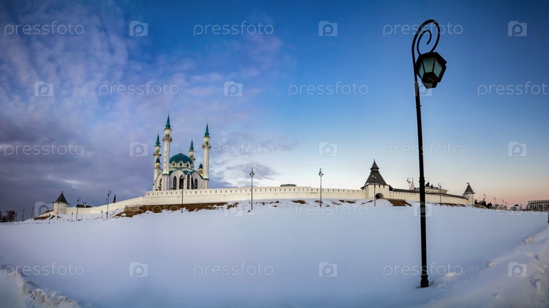 Стена Казанского кремля с мечетью Кул-Шариф на фоне дорожного фонаря