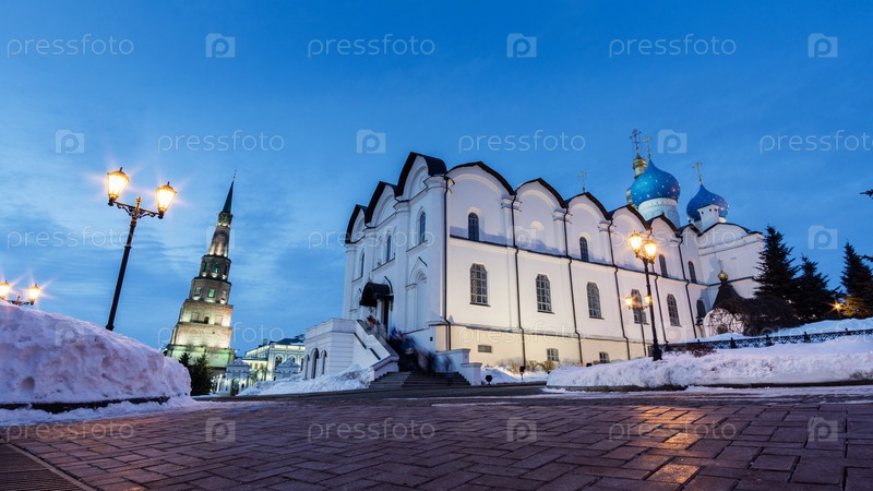 Благовещенский собор Казанского Кремля на фоне размытого неба зимой