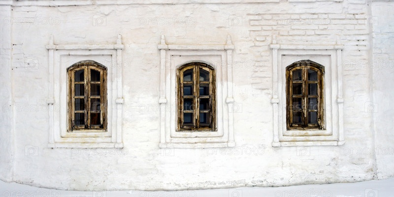Три старых окна в деревянных рамах в каменной белой стене