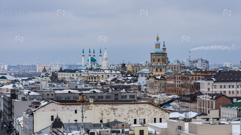 Вид с Богоявленской колокольни на ансамбль Казанского кремля зимой