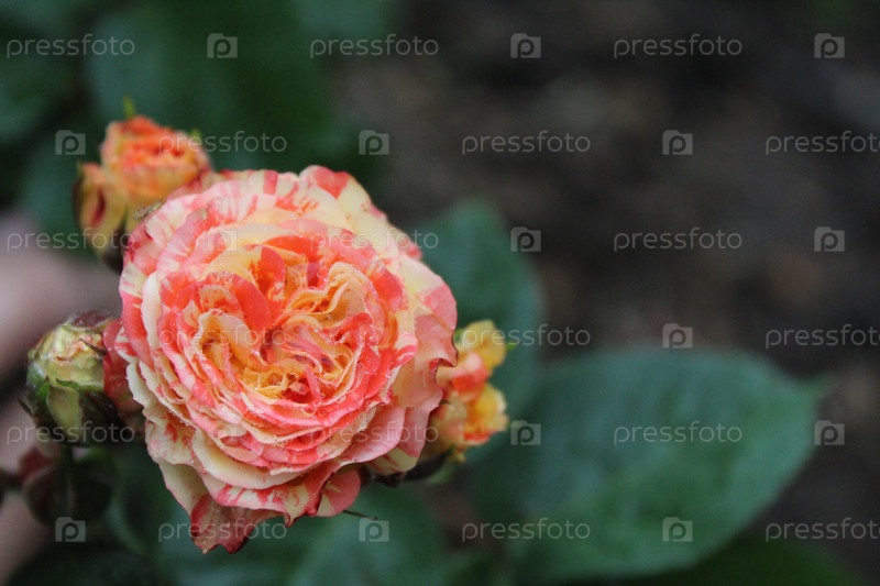 Кораллово-оранжевая пятнистая роза на фоне зелени с местом для текста. копиплаты
