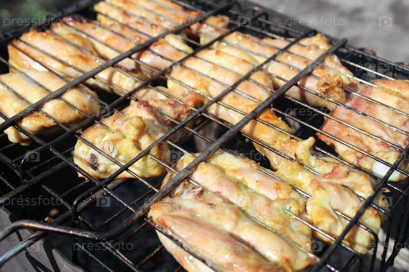 Мясо на гриле или куриный шашлык на гриле, обжаренный на углях летом
