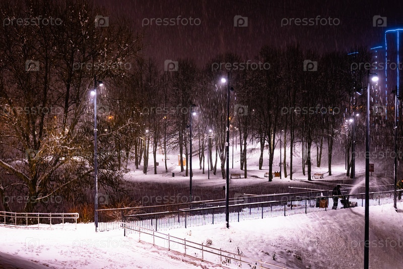 Зимний парк вечером, покрытый снегом, с рядом фонарей