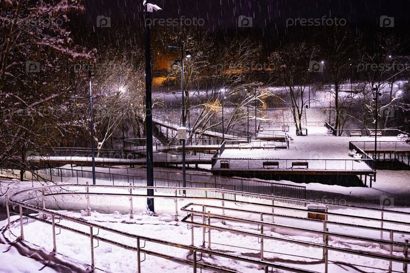 Зимний парк вечером, покрытый снегом, с рядом фонарей