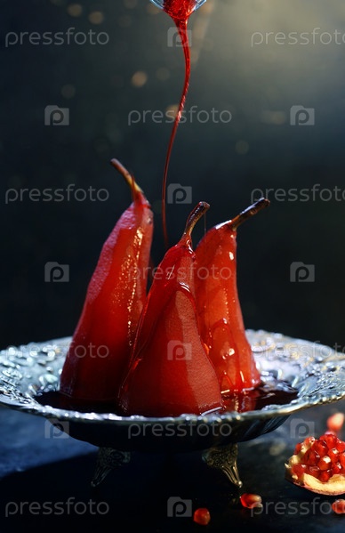 Вареная груша в красном вине на черном фоне