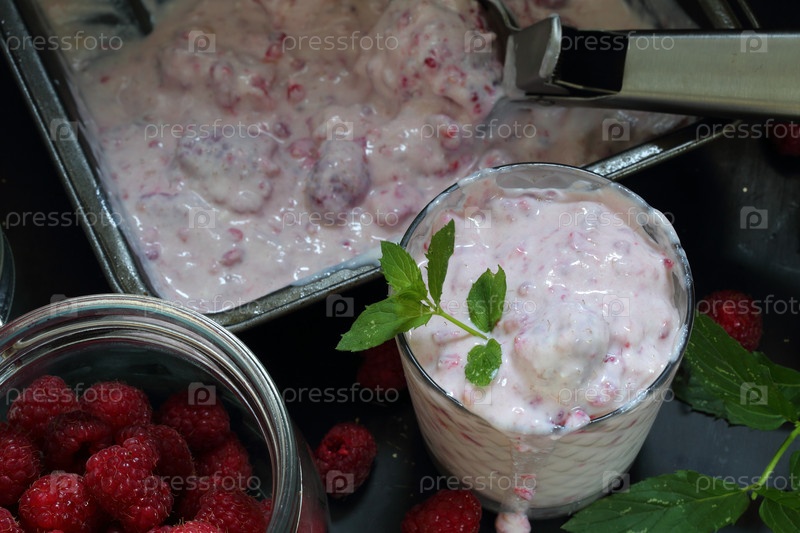 Мороженое с малиной на черном фоне