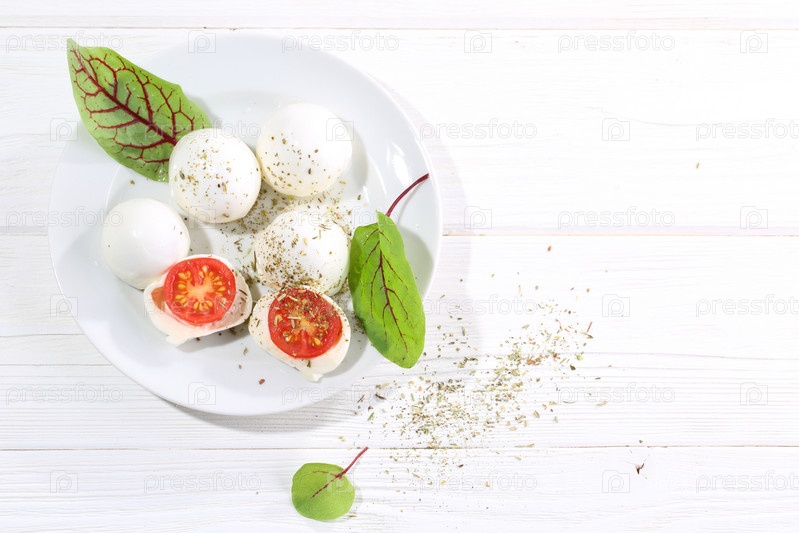 Моцарелла с помидорами черри на белом столе