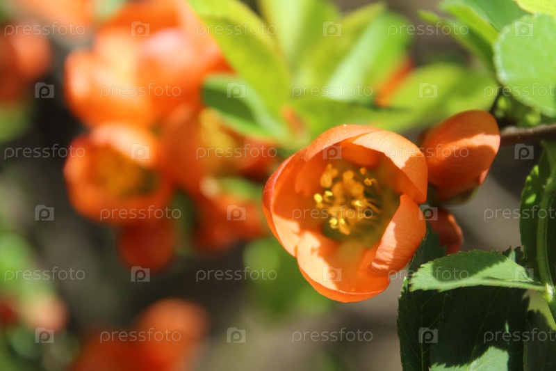 Апельсиновые цветы три айвы японской хеномелес. Цветение. Весеннее размножение цветка тычиночными пестиками