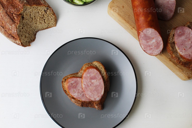 Бутерброд с колбасным сердцем на серой тарелке сверху. Завтрак в День святого Валентина. Утренний завтрак с чашечкой кофе