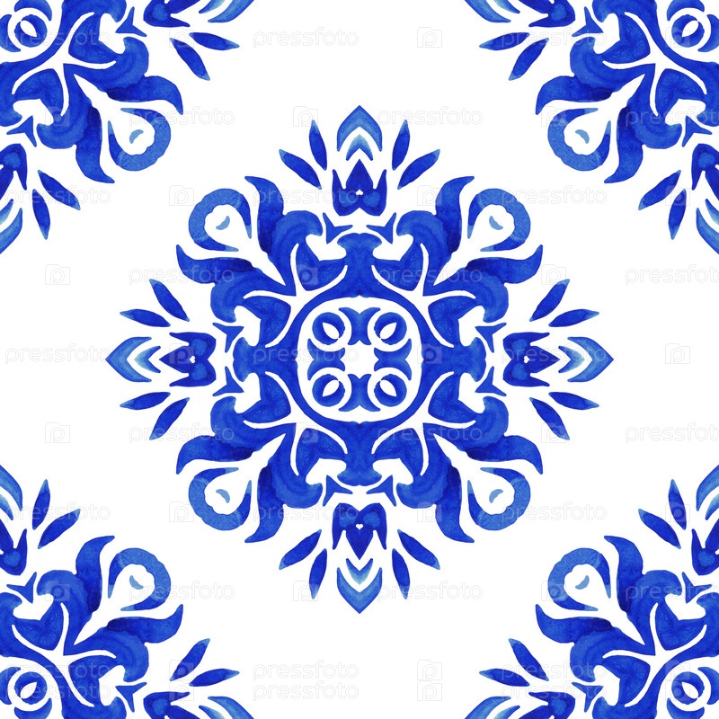 Акварель синего цвета дамаскинского рисунка. Бесшовный узор, мозаичный орнамент. Абстрактный филигранный фон в персидском стиле. Стилизация элемента португальской декоративной мозаики Blue azulejo