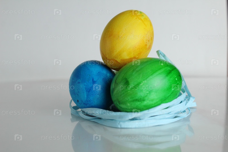 Три цветных сине-желто-зеленых яйца лежат в гнезде на белом фоне с копирайтом со стороны фон Пасхи
