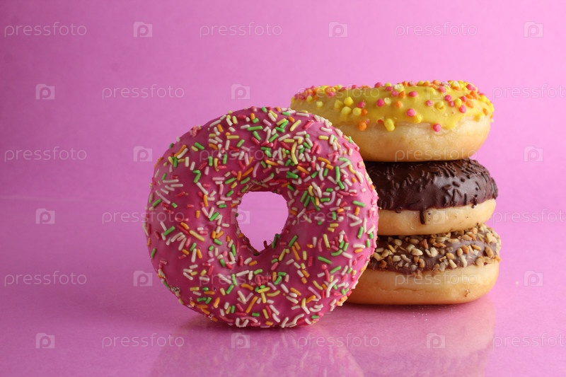 Сладкий натюрмортный пончик берлинер крупным планом сзади лежит стопка из трех пончиков шоколадно-розово-желтого цвета на ярко-розовом фоне цветов фуксии с местом для текста и cpixpe для кафе для постельных принадлежностей для клея