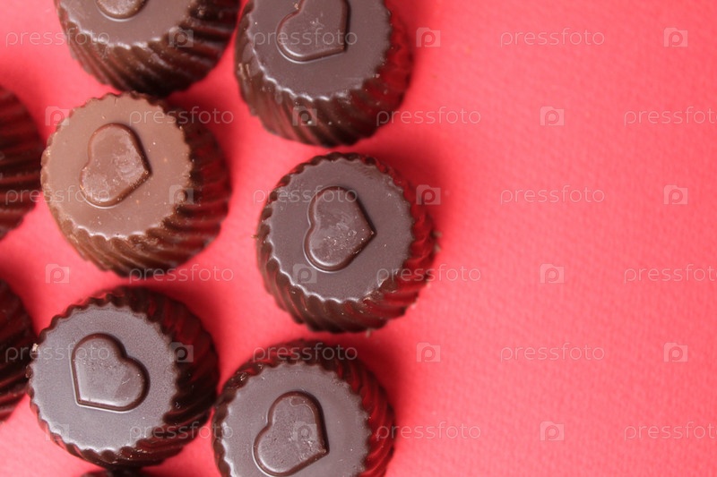 Конфеты в шоколадном чемодане с символом сердца. День святого Валентина шоколадные конфетки. Конфеты на красном фоне со пространством для текста copyspace