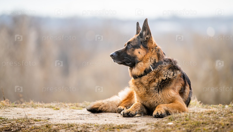 Портрет взрослой большой собаки немецкой овчарки, лежащей на сухой траве на природе весной или осенью