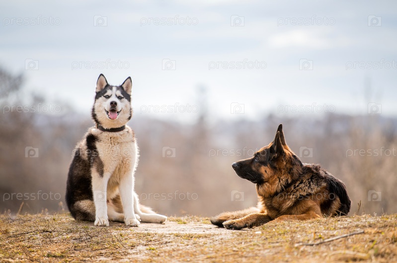 Хаски и немецкая овчарка сидят вместе на фоне природы. Собачья дружба