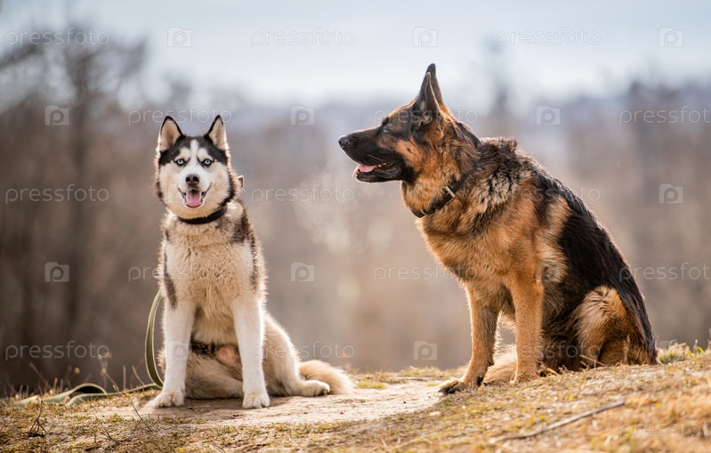 Хаски и немецкая овчарка сидят вместе на фоне природы. Собачья дружба