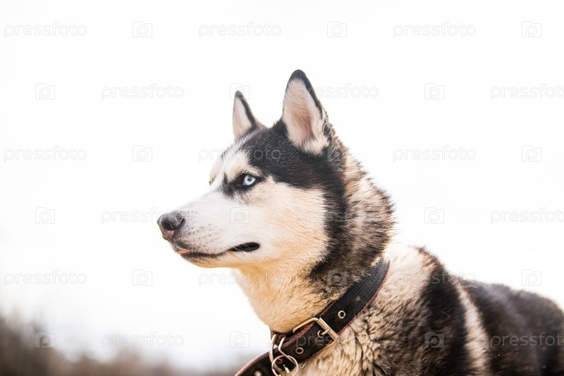 Портрет счастливой эмоциональной хаски. Сибирский хаски черно-белого окраса с голубыми глазами