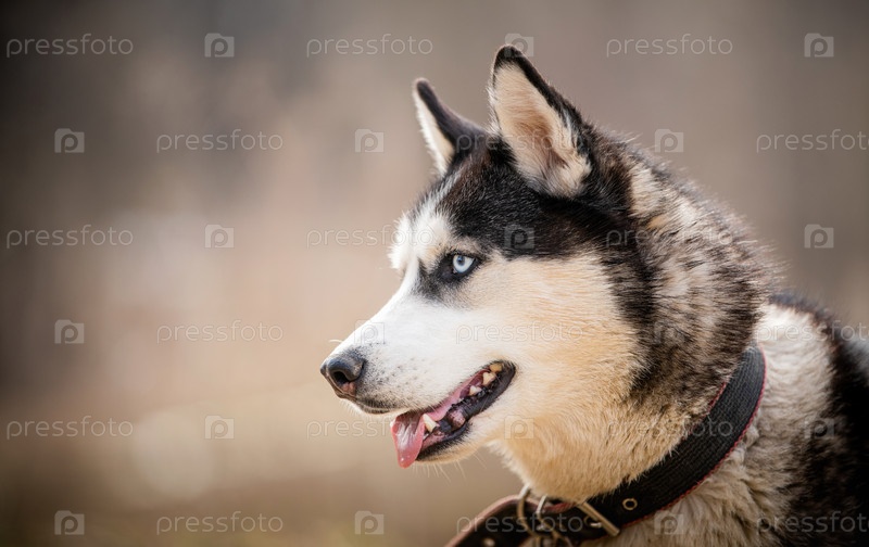 Портрет счастливой эмоциональной хаски. Сибирский хаски черно-белого окраса с голубыми глазами