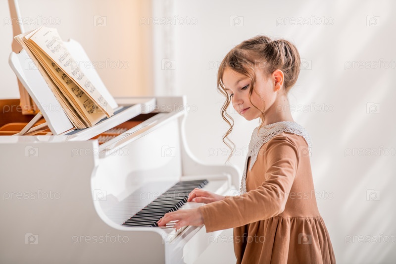 Маленькая девочка играет на большом белом пианино в яркой солнечной комнате