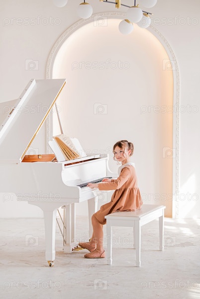 Маленькая девочка играет на большом белом пианино в яркой солнечной комнате