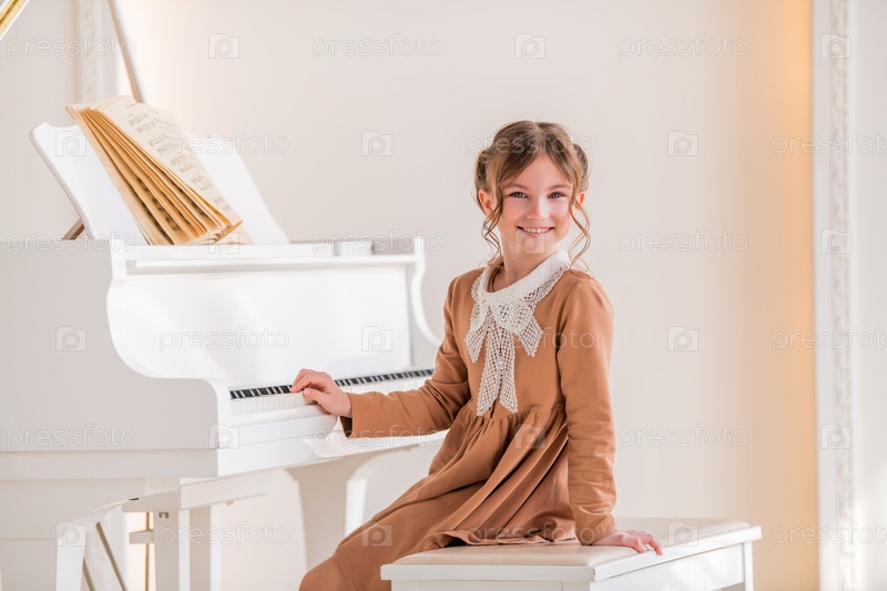 Маленькая девочка играет на большом белом пианино в яркой солнечной комнате