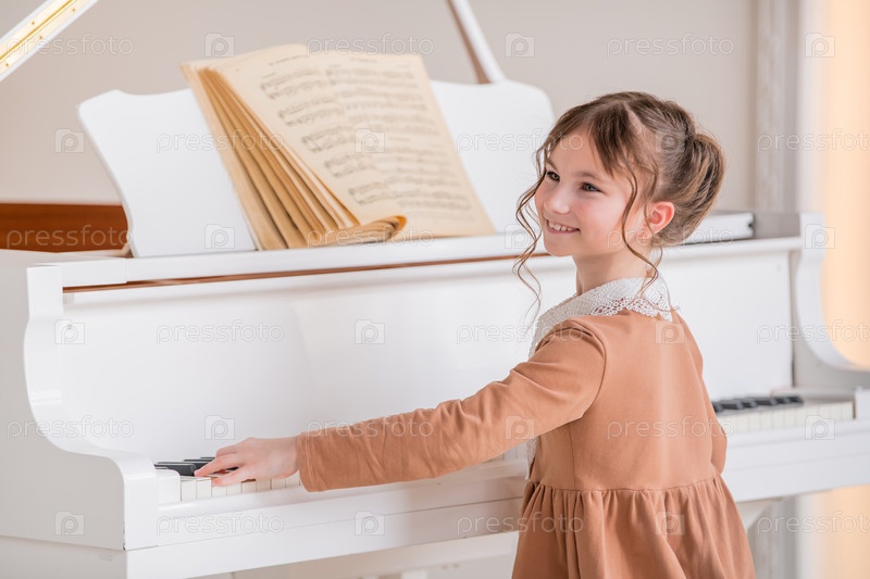 Маленькая девочка играет на большом белом пианино в яркой солнечной комнате