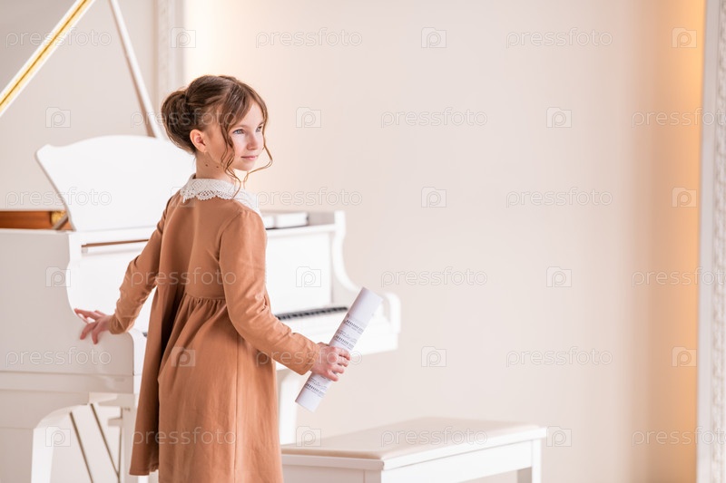 Маленькая девочка стоит с нотами рядом с большим белым роялем в яркой солнечной комнате