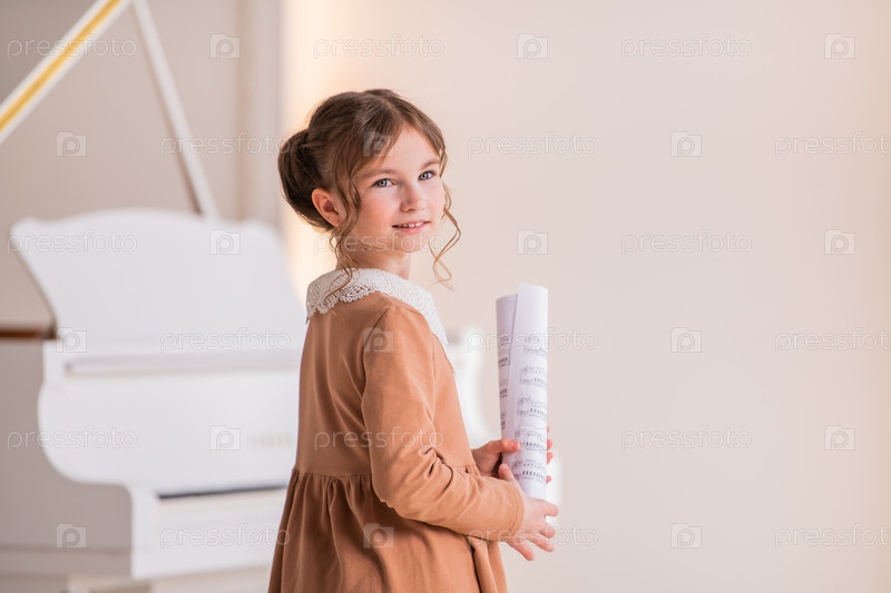 Маленькая девочка стоит с нотами рядом с большим белым роялем в яркой солнечной комнате
