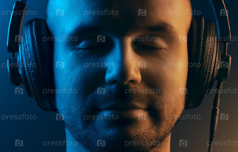 Мужчина слушает музыку в наушниках. Его глаза закрыты