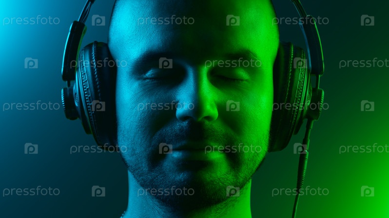 Молодой человек слушает музыку в наушниках. Его глаза закрыты. Сине-зеленая цветовая гамма