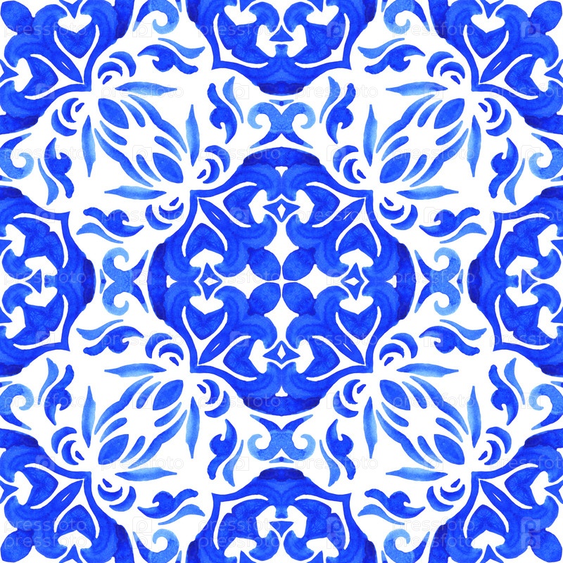 Бесшовный рисунок ручной работы акварельный орнамент сине-белый с цветочными элементами