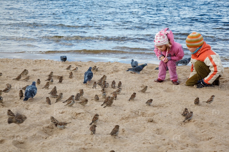 Мальчик и девочка кормят птиц на берегу реки