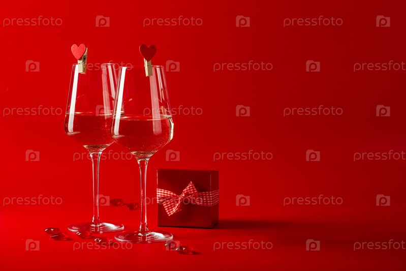 Два полных бокала вина на красном фоне