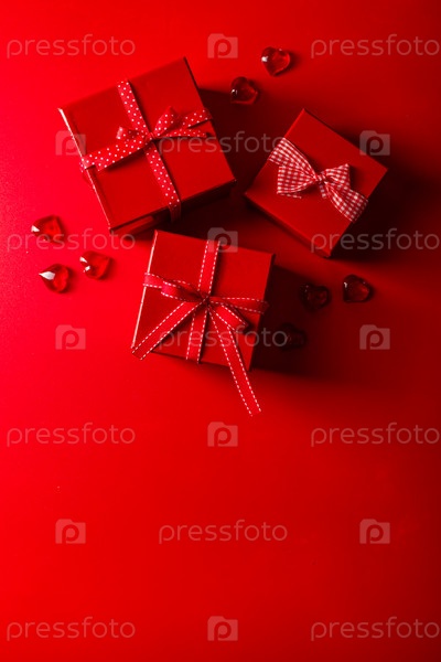 Две красные коробки с подарками и бантами, концепция Дня святого Валентина