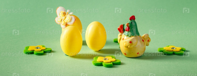 Пасхальные украшения в виде декоративных яиц и керамической курочки
